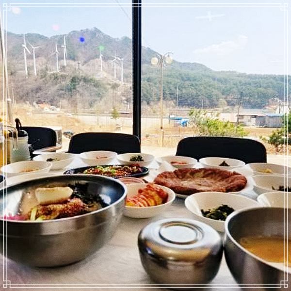 앞에는 설악산 중 한 줄기가 뻗어져 나와있는 산 줄기, 옆에는 느긋하게 돌아가는 풍차, 뒤에서는 개발이 안 된 산이기 때문에 종종 들리는 새소리 마지막으로 날 좋은 날에 보이는 대청봉까지... 한 손님 말씀처럼 신선이 왔다가도 '잘~ 쉬었다'라고 말할 수 있는 맛집입니다^^ 음식과 뷰, 두마리 토끼를 전부 잡고 싶다면 저희 산마을이 답입니다^^